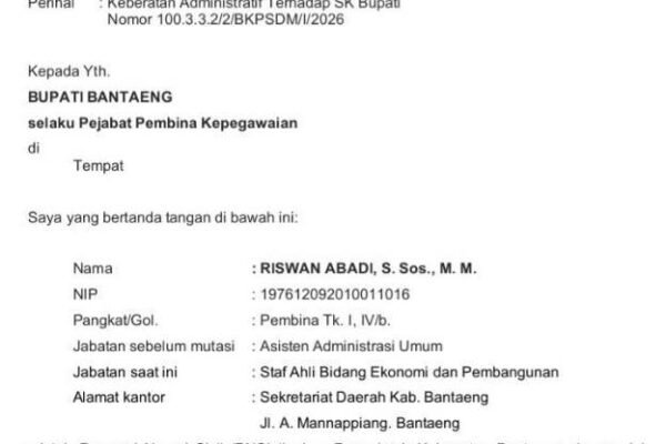 BANTAENG, Fajar Timur — Surat yang dilayangkan Riswan Abadi, mantan Asisten III Bidang Administrasi Umum Sekretariat Daerah Kabupaten Bantaeng, perihal Keberatan Administratif Terhadap SK Bupati Nomor 100.3.3.2/2/BKPSDM/I/2026, dinilai salahi tata naskah kedinasan. Dia menyanggah Bupati Bantaeng karena dimutasi sebagai Staf Ahli Bidang Ekonomi Pembangunan. “Kenapa mesti keberatan. Kan, dia tidak dirugikan”, ujar beberapa pejabat eselon…